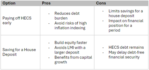 - Cash flow: How will paying off HECS or saving for a deposit affect your ability to meet your day-to-day expenses?