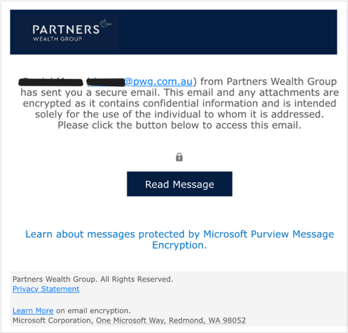 When we send you important documents, they will be encrypted for added security. An example of what an encrypted email from us will look like is pictured below. To access these encrypted files, you may need to use a one-time code or re-verify your email account. This extra step helps ensure that only you can access these documents.